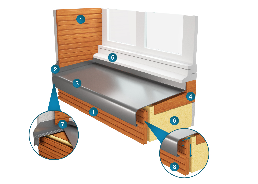 - une retombée de 50 mm en recouvrement de façade avec goutte d’eau pour déporter les eaux pluviales et protéger le bardage des dégradations courantes comme les coulures et les salissures.