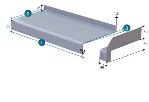 - Une tôle d’aluminium 15/10 ème avec une retombée de 50 mm et un relevé arrière de 25 mm.