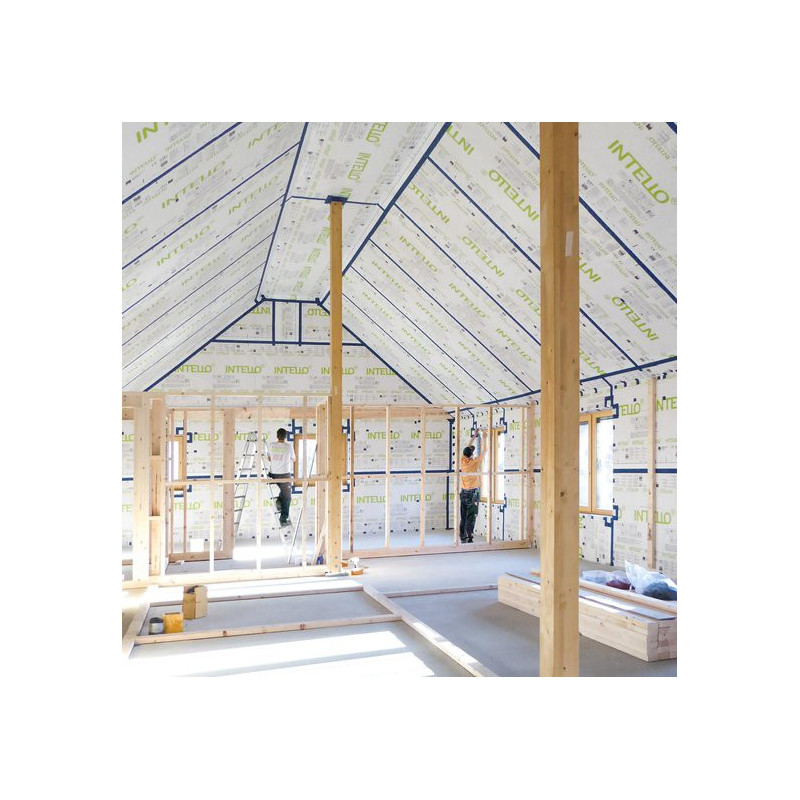 Pour éviter la formation de condensation, le collage étanche à l’air de la membrane INTELLO devrait se faire immédiatement après la mise en oeuvre de l’isolation thermique. Cela s’applique tout particulièrement aux travaux en hiver.