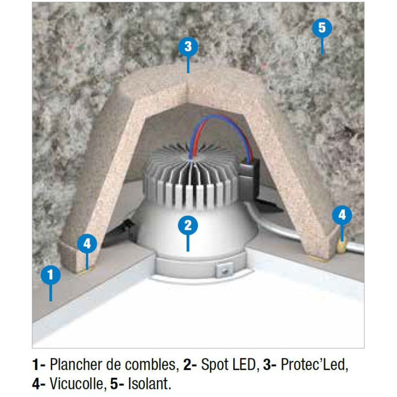 Protec’Led est disposé puis collé (vicucolle incluse dans le colis) au-dessus de chaque spot led mis en œuvre sur le plafond des combles. Les transformateurs sont positionnés à l’extérieur et les câbles à l’intérieur du capot doivent supporter une T° supérieure à 65°C. Les spots Led auront une puissance inférieure à 10W.