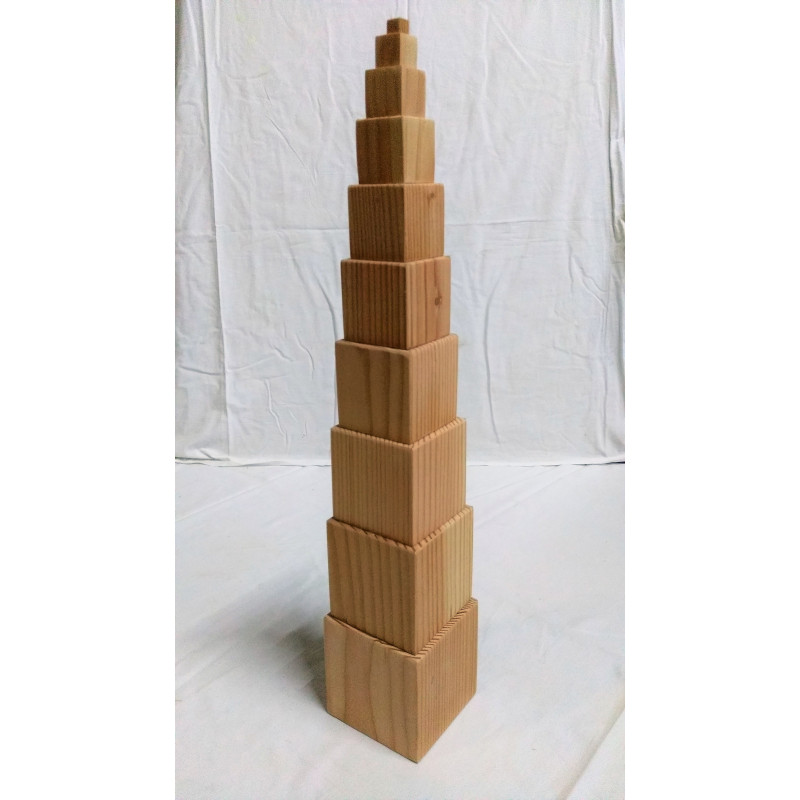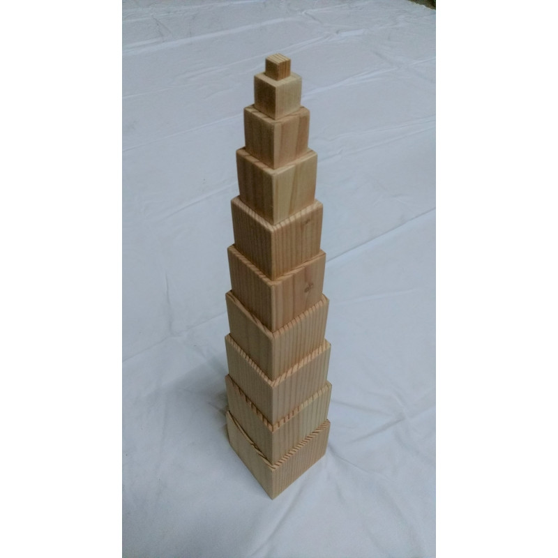 Matériel emblématique de la méthode Montessori, elle consiste en 10 cubes de bois bruts et d’arêtes croissantes de 1 cm à 10 cm.
