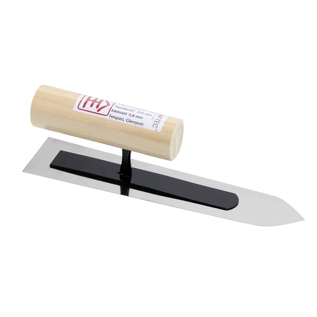Acier inoxydable laminé, tôle très fine et souple. Renfort dorsal arrondi à l’avant, épaisseur du renfort adaptée à l’évolution des forces de pression. Épaisseur de la feuille 0,3 mm. Truelle pour rehausser, lisser et finir les enduits d’argile.