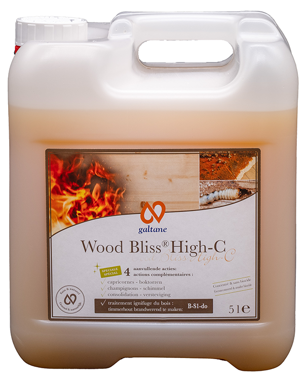 • Le Wood Bliss®High-C est un traitement naturel, non toxique des bois attaqués. Il ne contient pas de composants toxicologiques douteux (comme le confirment le bureau d’ingénieurs Zörner et le laboratoire Lafu : analyse chimique et microbiologique qui travaillent pour des entreprises indépendantes et neutres).